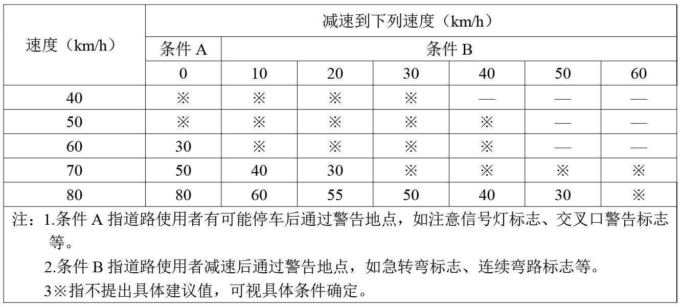 1、在上、下陡坡路段起點(diǎn)前方設(shè)置“上/下陡坡標(biāo)志”,可配合設(shè)置對(duì)坡道長(zhǎng)度說(shuō)明的輔助標(biāo)志,前置距離參見(jiàn)下