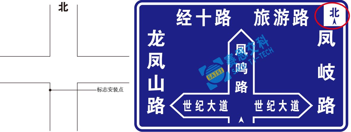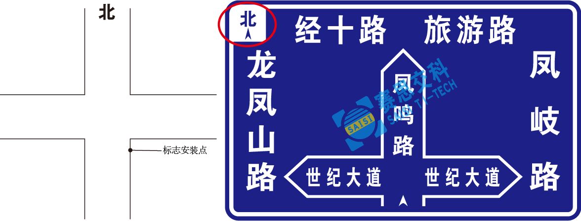 2、當(dāng)標(biāo)志設(shè)置在行駛方向右側(cè)時(shí)可在其版面左上角標(biāo)識(shí)地理方向信息;