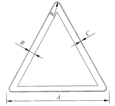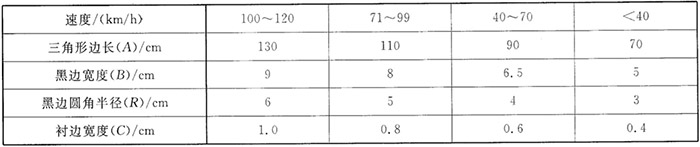 國標《道路交通標志和標線》(GB5768.2)中明確規(guī)定:警告類標志,形狀為正等邊三角型;反光膜顏色為黃、黑主配色;尺寸大小根據(jù)道路設(shè)計時速而定,通常有邊長70cm、90cm、110cm、130cm等四種。參考依據(jù)如下圖所示。