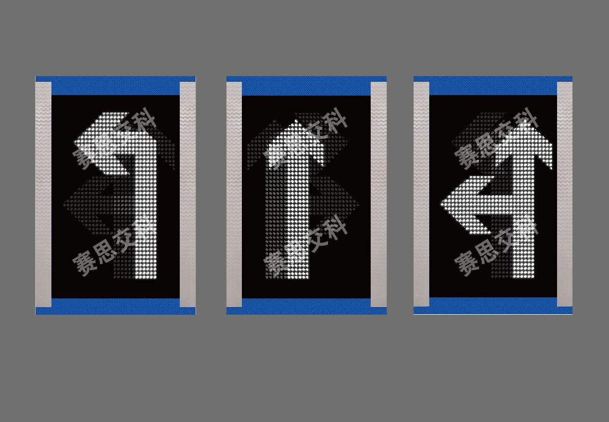 標志版面的圖形、文字、符號等關鍵信息采用全自動鏤空雕刻工藝,內置均光光源板,定向投射穿透專用透光膜及鏤空面,在標志面板形成視覺柔和的面光源發光標志版面,實現主動發光功能,提高在夜晚或惡劣交通環境中的全天候視認效果,提升潮汐車道信息的遠距離視認和動態易觀察性。標志參考圖如下: