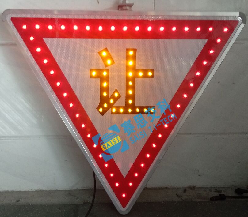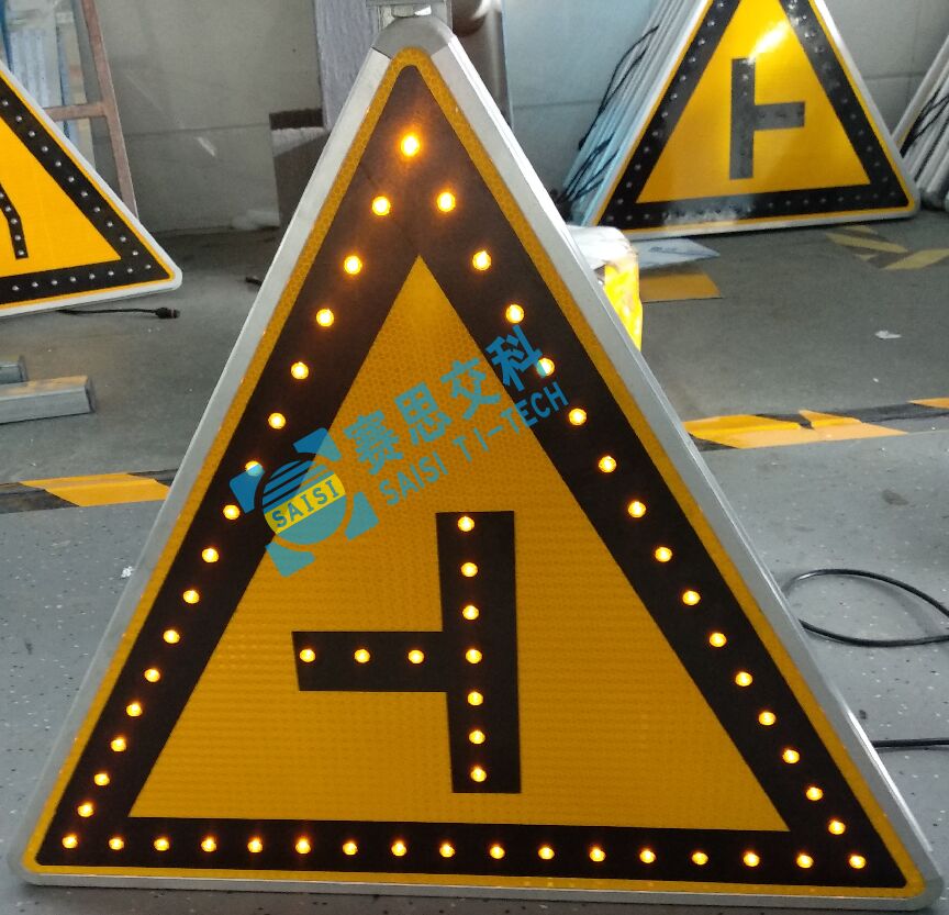 1、注意行人標志、注意兒童標志。版面尺寸:三角型,邊長90cm,單立柱安裝方式,太陽能供電。