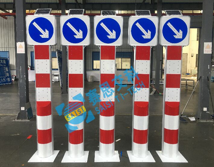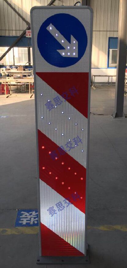 太陽(yáng)能右下行發(fā)光警示柱(樁),采用外置超高亮LED發(fā)光二極管,對(duì)頂部右下行標(biāo)志圖案輪廓進(jìn)行發(fā)光描邊,且標(biāo)志柱體均設(shè)置斜向紅白相間反光膜,也配置了發(fā)光管,標(biāo)志體整體采用太陽(yáng)能供電,通過(guò)內(nèi)置控制芯片,實(shí)現(xiàn)動(dòng)態(tài)閃爍,或常亮的工作模式,較普通標(biāo)志,具備更強(qiáng)的警示性,和遠(yuǎn)距離視認(rèn)性,經(jīng)測(cè)試,太陽(yáng)能右下行發(fā)光警示柱(樁),在夜晚環(huán)境中,靜態(tài)視覺距離大于400米;動(dòng)態(tài)視認(rèn)距離大于300米。