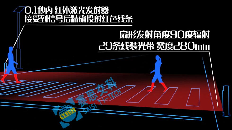當行人即將進入斑馬線將要過街的瞬間,本裝置快速、準確檢測到有行人過街,立刻投射28條紅色激光線到過街行人小腿處,形成明顯的紅色區域投影警示,機動車駕駛員可以在照明不足、注意力不集中或視線受影響情況下(對面車輛遠光、雨霧天氣等),遠距離得到紅色警示和發現行人動態,并及時做出反應,從而減少交通意外的發生。