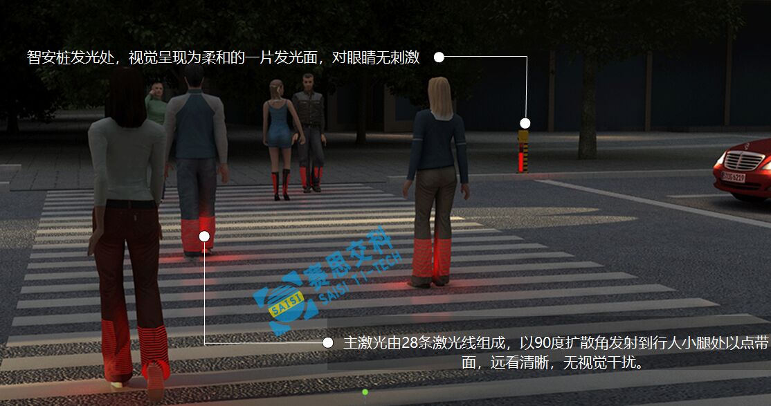 經權威檢測,智安樁的激光燈功率僅為舞臺燈的1/10。通過激光燈組以點帶面和特制光學透鏡的配合,激光線明亮柔和,在有效警示司機的同時,避免對人眼造成傷害。此外,光線集中不擴散、切面平整,光線保持在安全合理的位置,杜絕光線干擾和污染。