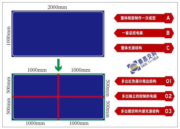 單塊標志的報價,不同的版面尺寸、版面內容,對標志的報價也會有一點的影響。1、版面尺寸。(1)版面尺寸在:1平米至15平米之間,按正常平方單價報價(**元/平米);(2)版面尺寸大于15平米時,因大版面需要加內部特殊加固結構,故其平方單價要比正常尺寸略高;通常會加50元/平米;(3)尺寸小于1平米時,小型標志需要多追加抱邊結構、控制電路、人工損耗等(如下圖:1塊1米*2米的標志,和4塊0.5米*1米相比較,雖面積相等,但造價成本卻有差異,顯然用同樣的平方單價計算就不合理。),故其通常按單套報價(**元/套),若折算為平方單價,通常會乘以1.2—1.3的系數。