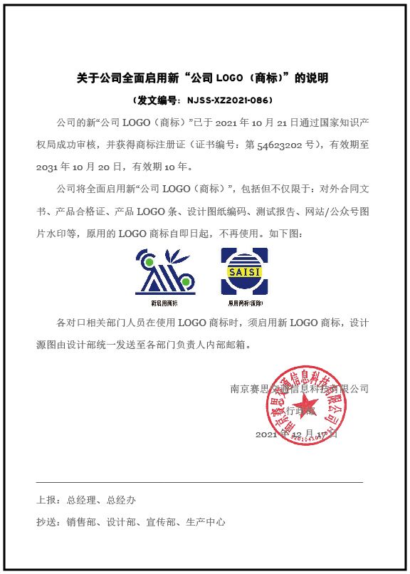 公司將全面啟用新“公司LOGO(商標)”,包括但不僅限于:對外合同文書、產品合格證、產品LOGO條、設計圖紙編碼、測試報告、網站/公眾號圖片水印等,原用的LOGO商標自即日起,不再使用。