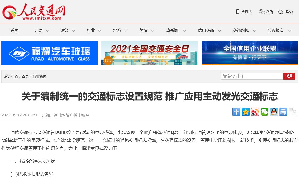 附件:“人民交通網(wǎng)”2022年1月12日發(fā)文《關(guān)于編制統(tǒng)一的交通標(biāo)志設(shè)置規(guī)范 推廣應(yīng)用主動(dòng)發(fā)光交通標(biāo)志》截圖。