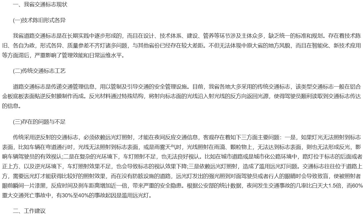 傳統(tǒng)的逆反射交通標(biāo)志,在特殊的交通環(huán)境種,存在功能的局限性。《人民交通網(wǎng)》于2022年1月12日發(fā)文《關(guān)于編制統(tǒng)一的交通標(biāo)志設(shè)置規(guī)范 推廣應(yīng)用主動(dòng)發(fā)光交通標(biāo)志》中提到:“傳統(tǒng)采用逆反射的交通標(biāo)志,必須依賴遠(yuǎn)光燈照射,才能在夜間反應(yīng)交通信息,客觀存在著如下三方面主要問題:一是,如果燈光無法照射到標(biāo)志表面,比如車輛在彎道通行時(shí),光線無法照射到標(biāo)志表面,或是雨霧天氣時(shí),光線照射在雨滴、顆粒物上,無法達(dá)到標(biāo)志表面,則也無法形成反光,影響車輛駕駛員的有效視認(rèn);二是在復(fù)雜的光環(huán)境下,車燈照射不足,也無法良好視認(rèn)。比如在城市道路或是城市化公路環(huán)境中,路燈位于標(biāo)志的后面或者正上方、以及逆光環(huán)境下,車燈照射效果不足,也會(huì)導(dǎo)致標(biāo)志的視認(rèn)效果下降;三是依賴遠(yuǎn)光燈照射,造成了濫用遠(yuǎn)光燈問題。交通標(biāo)志往往位于道路上方,需要遠(yuǎn)光燈才能獲得比較好的照射效果,而在沒有防眩設(shè)施的道路,遠(yuǎn)光燈發(fā)出的強(qiáng)光照到對(duì)面駕駛員或者行人的眼睛時(shí)會(huì)導(dǎo)致致盲,使被照射者眼前瞬間一片漆黑,反應(yīng)時(shí)間及剎車距離增加近一倍,帶來嚴(yán)重的安全隱患。根據(jù)公安部的統(tǒng)計(jì)數(shù)據(jù),夜間發(fā)生交通事故的幾率比白天大1.5倍,而60%重大交通死亡事故中,有30%至40%的事故起因是濫用遠(yuǎn)光燈。”。