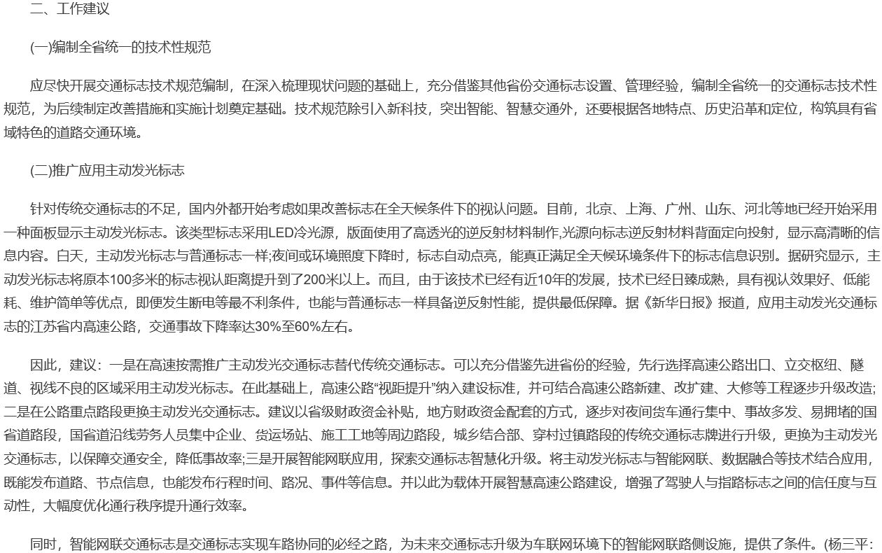 主動(dòng)發(fā)光標(biāo)志,因其具備獨(dú)特的功能優(yōu)勢(shì),主要有:(1)能主動(dòng)發(fā)光,不需依賴汽車遠(yuǎn)光燈照射;(2)提升標(biāo)志的遠(yuǎn)距離視認(rèn)性;(3)增強(qiáng)標(biāo)志的易捕捉性和警示性;(4)增強(qiáng)標(biāo)志在雨、霧、冰、雪、霾、逆光等惡劣交通環(huán)境中,仍能保持良好的顯示效果。上述功能能彌補(bǔ)在特殊交通環(huán)境中普通逆反射標(biāo)志的功能不足現(xiàn)象。為此,文中還給出相關(guān)建議:“一是在高速按需推廣主動(dòng)發(fā)光交通標(biāo)志替代傳統(tǒng)交通標(biāo)志。可以充分借鑒先進(jìn)省份的經(jīng)驗(yàn),先行選擇高速公路出口、立交樞紐、隧道、視線不良的區(qū)域采用主動(dòng)發(fā)光標(biāo)志。在此基礎(chǔ)上,高速公路“視距提升”納入建設(shè)標(biāo)準(zhǔn),并可結(jié)合高速公路新建、改擴(kuò)建、大修等工程逐步升級(jí)改造;二是在公路重點(diǎn)路段更換主動(dòng)發(fā)光交通標(biāo)志。建議以省級(jí)財(cái)政資金補(bǔ)貼,地方財(cái)政資金配套的方式,逐步對(duì)夜間貨車通行集中、事故多發(fā)、易擁堵的國(guó)省道路段,國(guó)省道沿線勞務(wù)人員集中企業(yè)、貨運(yùn)場(chǎng)站、施工工地等周邊路段,城鄉(xiāng)結(jié)合部、穿村過鎮(zhèn)路段的傳統(tǒng)交通標(biāo)志牌進(jìn)行升級(jí),更換為主動(dòng)發(fā)光交通標(biāo)志,以保障交通安全,降低事故率;三是開展智能網(wǎng)聯(lián)應(yīng)用,探索交通標(biāo)志智慧化升級(jí)。將主動(dòng)發(fā)光標(biāo)志與智能網(wǎng)聯(lián)、數(shù)據(jù)融合等技術(shù)結(jié)合應(yīng)用,既能發(fā)布道路、節(jié)點(diǎn)信息,也能發(fā)布行程時(shí)間、路況、事件等信息。并以此為載體開展智慧高速公路建設(shè),增強(qiáng)了駕駛?cè)伺c指路標(biāo)志之間的信任度與互動(dòng)性,大幅度優(yōu)化通行秩序提升通行效率。”