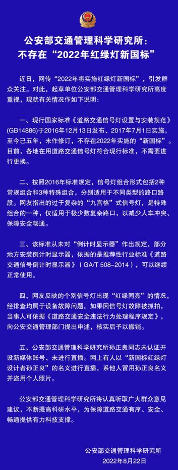首先,這個所謂的“新版紅綠燈”,其實并非是最新的。我國當前的紅綠燈設置標準仍是參照國標《道路交通信號燈設置與安裝規范》(GB14886)技術要求,該標準早在2016年12月13日就已發布,并于2017年7月1日正式實施,至目前,也尚無最新的升級版本,最新版號仍是“GB14886-2016”,在該標準中,就已提出關于這種新型“信號燈盤組合”的相關內容,所以,這個所謂的“新版紅綠燈”,根本沒有“新”字一說,只是這個叫法的始作俑者,嘩眾取寵,誤導大眾。為此,公安部交通管理科學研究所也于2022年8月22日專門發文給予辟謠。