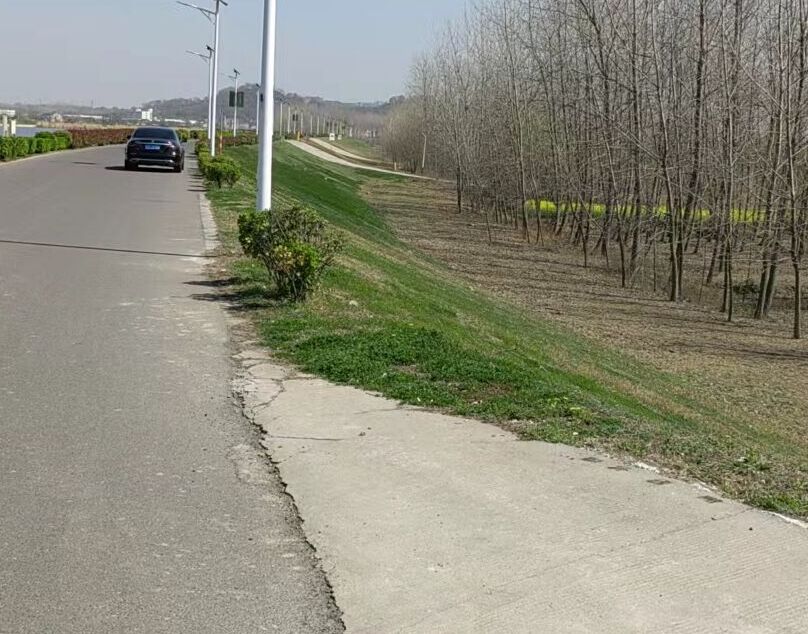 如下圖:前方有一段鄉村路交叉匯入主線,主線兩側卻沒有岔口警告標志;小叉路路寬較窄,幾乎只能容下單車通行,傍晚時常有附近的居民從這條路上河堤散步,等散步完回家時,天色已黑,這條路照明條件不好,如果有車輛從河堤上俯沖下來,下面有人,就會非常危險;且陡坡下來不遠就是池塘,沒有提示標志、沒有防撞護欄。下圖左:右側叉口在主線上被苗圃遮擋,出口無法發現:下圖右:叉口很窄,且向下不遠就是池塘。