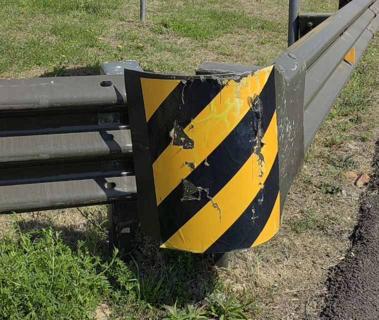 如下圖:前方道路突然向右改道,與前方主線道路交叉接入,僅靠正前方的護欄上黏貼6個反光膜向右箭頭(反光膜已基本散失反光效果),我們走近可以發現,護欄端頭上“傷痕累累”,可見不知有多少次的碰撞事故曾發生過。下圖左:前方突然向右改道;下圖右:護欄端頭傷痕累累。