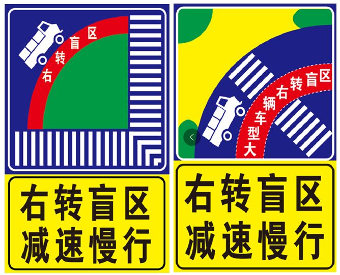 穿村鎮(zhèn)公路,不同于市區(qū)道路,肯定是在物流線路規(guī)劃區(qū)域內(nèi),貨車流量必然有所分布,而貨車駕駛存在一個(gè)最大的操作性隱患,即:“大貨車右輪視距盲區(qū)”,這類專題,很多專業(yè)論文及“公眾號(hào)”都有專文闡述,此處不在詳述。推薦部分發(fā)光標(biāo)志版面如下: