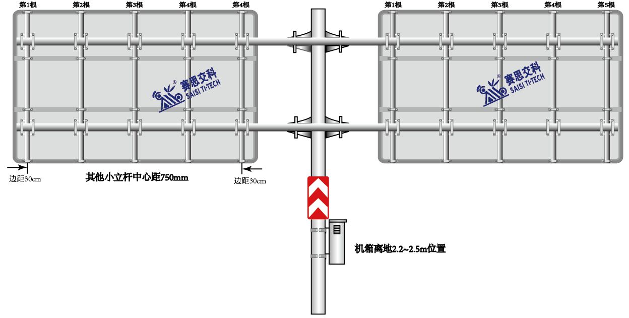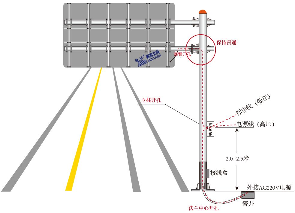 (3)安裝控制機箱。首先正確選擇待安裝標志所對應的機箱,不同標志對應不同機箱(因機箱最大承受負載不同,在機箱上貼有對應標志版面),不得隨意混雜機箱使用。新建桿件應按下圖所示開孔,讓管線在桿件內部;控制箱安裝于路外一側,離低高度約為2.2~2.5米,此高度,單人無法夠著;若有故障需檢修時,人字梯也方便檢修。