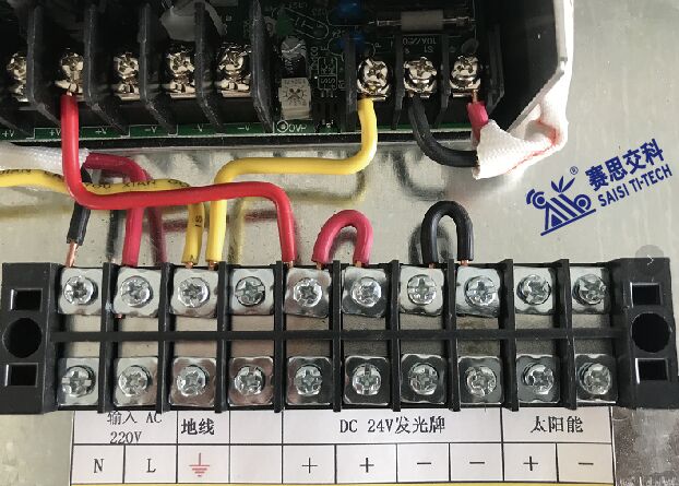 (4)控制線接電。本操作必須為持證的專業(yè)電工!!標志牌背面出1根2芯電纜線,內部工作電壓為DC24V,注意區(qū)分電線的正負極(具體供貨隨附的《安裝說明書》會詳細列明),將這兩根線接入"DC發(fā)光標志牌"所示接線端子上,嚴謹接入旁邊的高壓區(qū)!!接線板如下圖所示。將“空開”按鍵下拉至“關閉”狀態(tài) ,再將市電接線接入左側,輸入AC220V的接線端子,在開啟電源前,先檢查以下接線,確保準確無誤后,方可開啟電源。注:控制系統(tǒng)為自動光控(白天不亮,夜晚自動開啟),白天安裝時,需測試,可用黑色物蓋在控制箱的光敏端子上,模擬夜晚效果。
