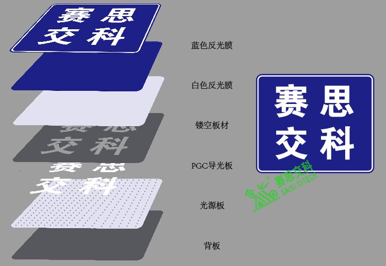 背透式主動發(fā)光標志,以藍白配色的指路標志為例,如果從正面一刀切開,我們會依次看到:藍色反光膜、白色反光膜、鏤空雕刻的鋁板(鏤空位置填充的PGC透光板)、高亮混光型光源板(含內(nèi)部支撐結(jié)果)、電路元器件、標志背板、滑槽。而所有的這些,都要集中布設(shè)在厚度僅為4cm左右的框體結(jié)構(gòu)內(nèi),所以,對整體結(jié)構(gòu)的穩(wěn)定性、布設(shè)的合理化、用材搭配的精細化,都要求非常高。