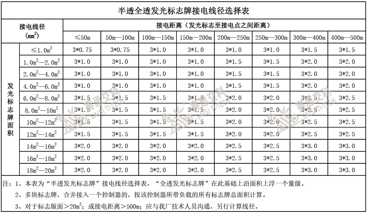 半透全透式內(nèi)置照明發(fā)光標(biāo)志,其接電線材的線徑選擇,主要受著幾方面因素影響:(1)控制器負(fù)載發(fā)光標(biāo)志牌的整體功耗。發(fā)光標(biāo)志牌采用內(nèi)置LED光源板,標(biāo)志版面越大,其所用的光源板面積就越大,整體功耗也就越大,所以,發(fā)光標(biāo)志牌的功耗,通常與其版面面積大小成正比關(guān)系,業(yè)內(nèi)也常根據(jù)版面面積來測算標(biāo)志的大概功耗情況,標(biāo)志的功耗越大,其接電所需的線徑也就越大。(2)接電距離的遠(yuǎn)近。發(fā)光標(biāo)志牌的取電距離,是指標(biāo)志牌安裝地點(diǎn)到接電處的距離,根據(jù)電學(xué)常識,我們知道,同等線徑的線材,其取電距離越長,電阻越大,其電壓衰減就越明顯,所以,對于接電距離長的,要保證具備穩(wěn)定的電壓承載負(fù)載電壓,就需要提高足夠的線徑給予保障。(3)發(fā)光標(biāo)志類型。半透式發(fā)光標(biāo)志牌,是僅僅標(biāo)志版面中的內(nèi)容、圖案、線條部分發(fā)光,而非像全透發(fā)光標(biāo)志那樣整體版面都發(fā)光,所以,前者的單位面積的功耗,較后者略低點(diǎn)。現(xiàn)將內(nèi)置照明發(fā)光標(biāo)志的接電線徑參考表,整理如下: