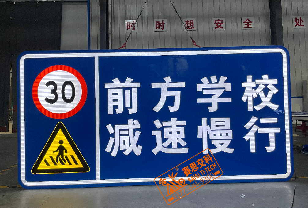 “內(nèi)置LED投射”工藝,主要包括:半投射(半透)和全投射(全透)兩種。半投射工藝,僅適用于版面的文字、字符、圖案、邊款線等為白色的標(biāo)志(如:指路標(biāo)志、指示標(biāo)志、旅游標(biāo)志等),因為深色系的反光膜透光率低,不能滿足行業(yè)標(biāo)準(zhǔn)《內(nèi)部照明標(biāo)志》中關(guān)于“透光率大于20%”的指標(biāo)要求,而常常有些指示標(biāo)志中,會加入禁令、警告標(biāo)志,這種組合型標(biāo)志,就需要多種工藝來實現(xiàn)。在我們“賽思企業(yè)標(biāo)準(zhǔn)”中,通常這樣處理:對于小型標(biāo)志(面積小于4平方米),采用全投射工藝;對于大型標(biāo)志(面積大于4平方米),其中白色圖案部分采用“半投射工藝”,深色系圖案部分采用“全投射工藝”(如下圖),或外置LED點陣工藝。