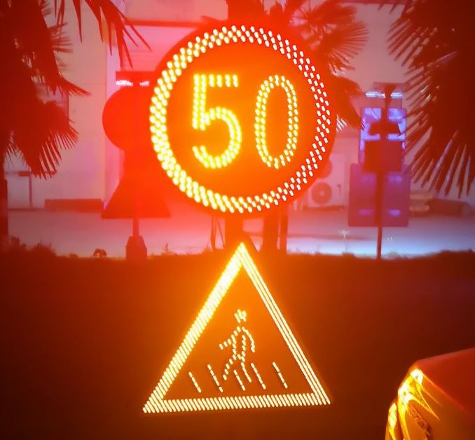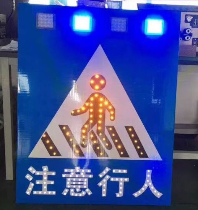 “外置LED點陣”工藝,所應(yīng)用的LED發(fā)光管具備極強的光穿透性,特別是在陰雨、霧霾等道路能見度低的交通場景中,其優(yōu)點在于表現(xiàn)關(guān)鍵圖案的警示效果,再應(yīng)用頻閃的發(fā)光模式,根據(jù)遠距離警示效果,尤其適用于提示道路危險源的警示標(biāo)志,和傳達管理指令的禁令標(biāo)志等。但其不足之處在于:顯示文字、字符、小圖案等沒有“內(nèi)置LED投射”工藝那么飽滿、平整。所以,為追求最佳視覺效果,通常會根據(jù)同一塊版面中的不同內(nèi)容,選擇最佳的工藝表現(xiàn)方式,如:可變車道標(biāo)志、潮汐車道標(biāo)志,我們會采用這樣的工藝方式處理,邊緣線采用的半投射工藝,箭頭采用“外置LED點陣”工藝。如:帶有輔標(biāo)的禁令標(biāo)志,禁令圖標(biāo)部分采用“外置LED點陣”工藝,輔標(biāo)部分采用“內(nèi)置LED投射”的全投射工藝。