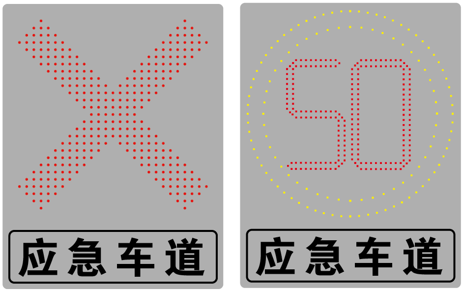 5、標志版面:“應急車道”為共用版面,另圖案“紅叉”與“限速禁令”版面二合一。