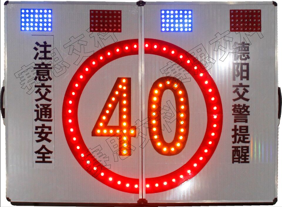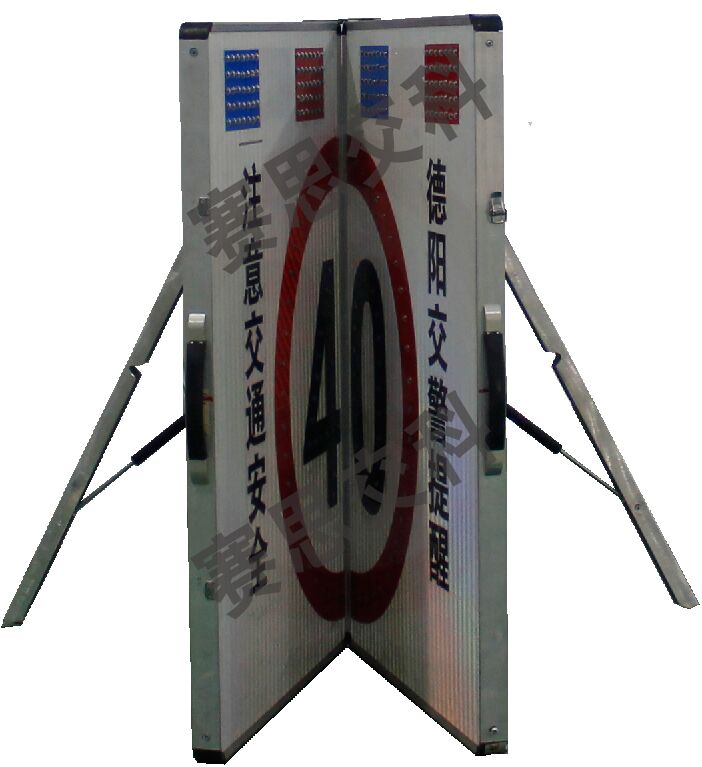 2、標志版面設置LED發光限速標志圖案,上置2組(紅爆閃燈+藍爆閃燈),兩邊設置交通警示標語或管制單位。標志整體展開后,配置支撐架,放置于管理路段,標志閉合時,配有手提把,警員可輕松提攜,方便、便攜。